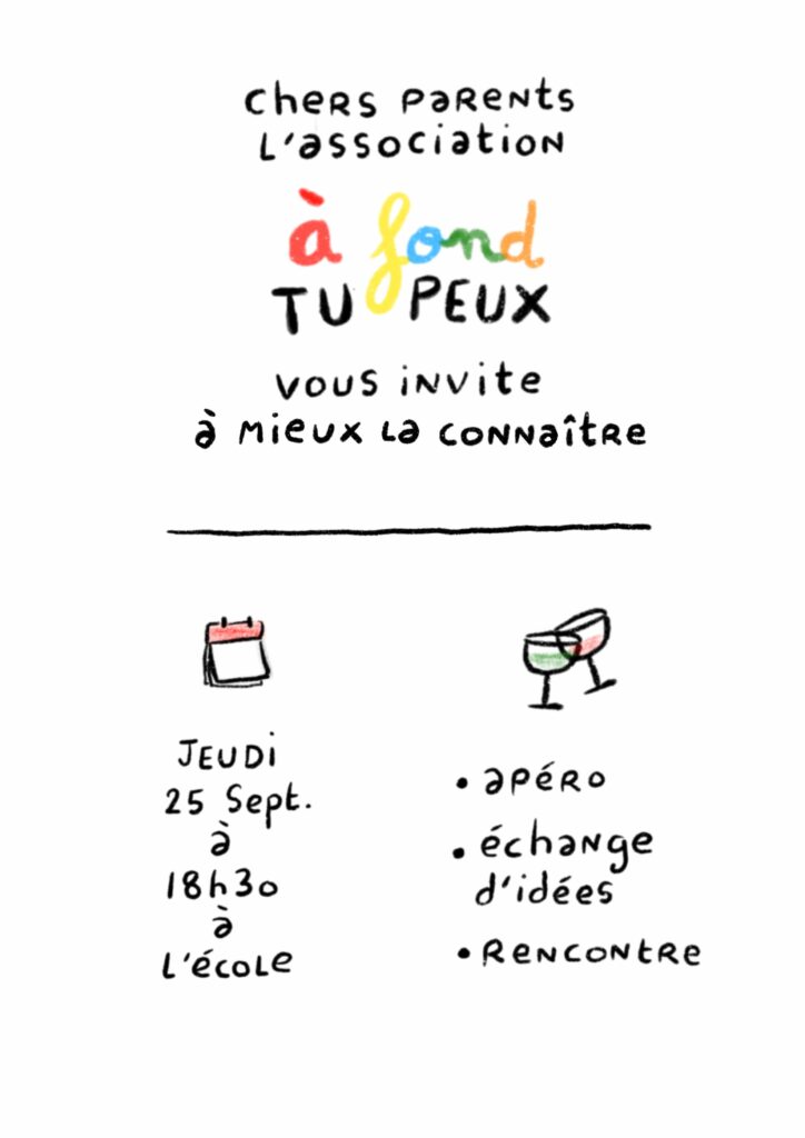 Mais comme un apéro vaut mieux qu’un long discours, nous vous invitons à venir nous rencontrer le jeudi 25 septembre à partir de 18h30 à l’école.
